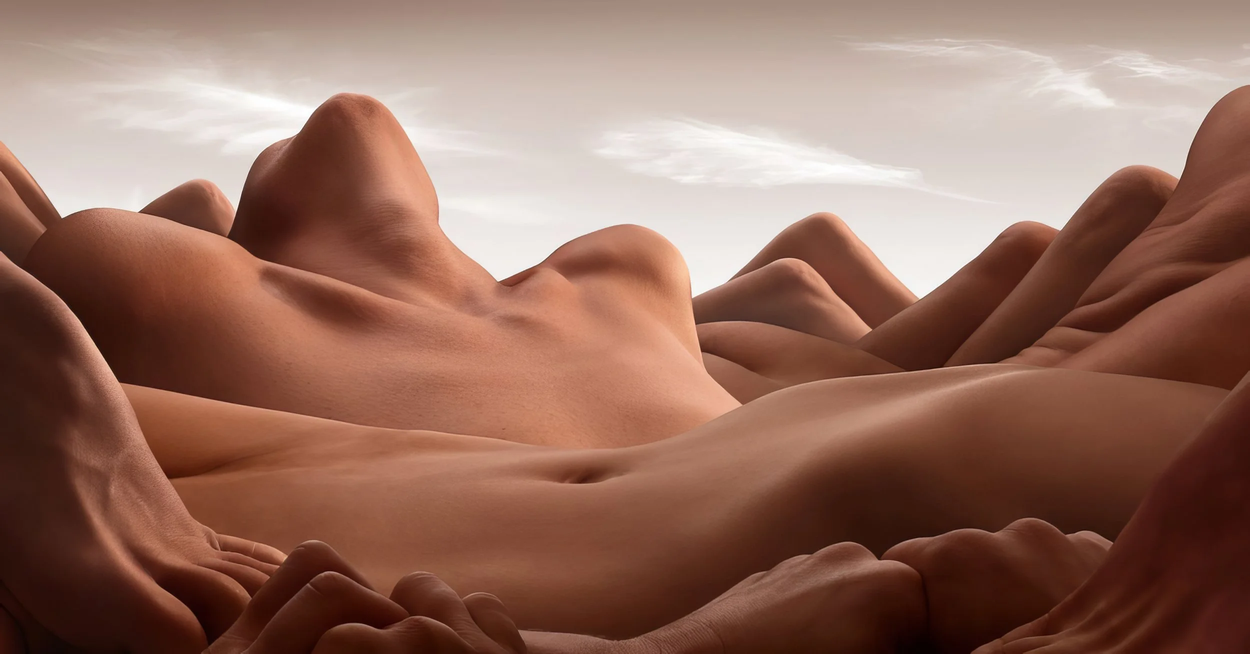 Carl Warner’s bodyscapes intricately arrange human forms to mirror natural landscapes, revealing a profound connection between humanity and nature. These compositions blur the boundaries between self and environment, presenting the body as an integral part of a larger whole. Warner’s work challenges perceptions of perfection and prompts reflection on how our relationship with our bodies influences our connections with others and the world. He views the body as a map marked by the scars of life’s journey. Whether cared for, abused, adored, or neglected, these marks offer a unique form of portraiture that abstractly reflects our inner selves. Warner’s bodyscapes invite viewers to explore this dynamic relationship and celebrate the human body as a landscape of wonder.